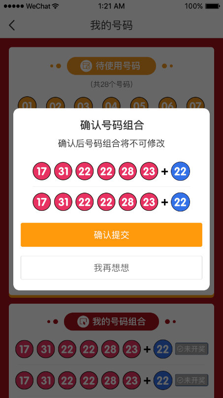 将获得的数字进行组合,搭配成6+1的形式,提交至后台,即可等待开奖。